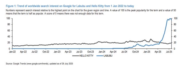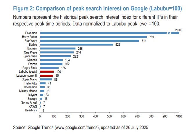 摩根大通的数据显示,即便在回落后,Labubu当前的搜索指数依然是KAWS和Sonny Angel的13倍,是哆啦A梦的3倍,更是经典IP Hello Kitty的2.5倍。