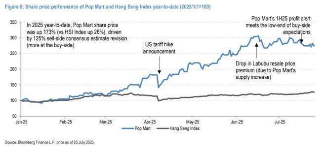 这一观点发布的背景是,自7月15日发布强劲的半年度业绩预告以来,泡泡玛特的股价不涨反跌,累计下跌7%,同期恒生指数则上涨3%。市场将此表现归因于其业绩增幅虽惊人,上半年销售额增长超200%、净利润增长超350%,但仅触及部分买方机构预期的下限。同时,Labubu的转售价格和搜索热度回落也加剧了投资者的不安。